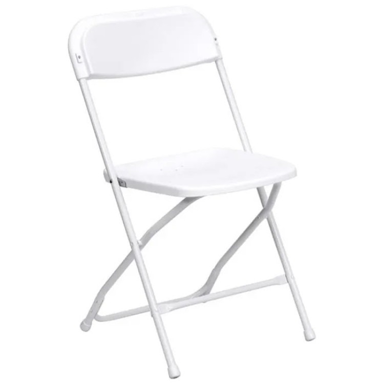 Simple, sturdy white folding chairs that stack easily when not in use and unfold in seconds to provide comfortable, no-fuss seating for guests; made with a durable metal frame and a contoured plastic seat and back, they’re lightweight for quick setup yet stable enough for prolonged use at parties, ceremonies, or event packages, and they tuck neatly into packages as an accessory to accommodate extra attendees without taking up permanent space. NEW 2026.